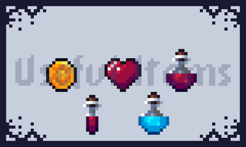 Letter, Meat, gold coin, silver, copper, heart, Mana potion and small and large health potion